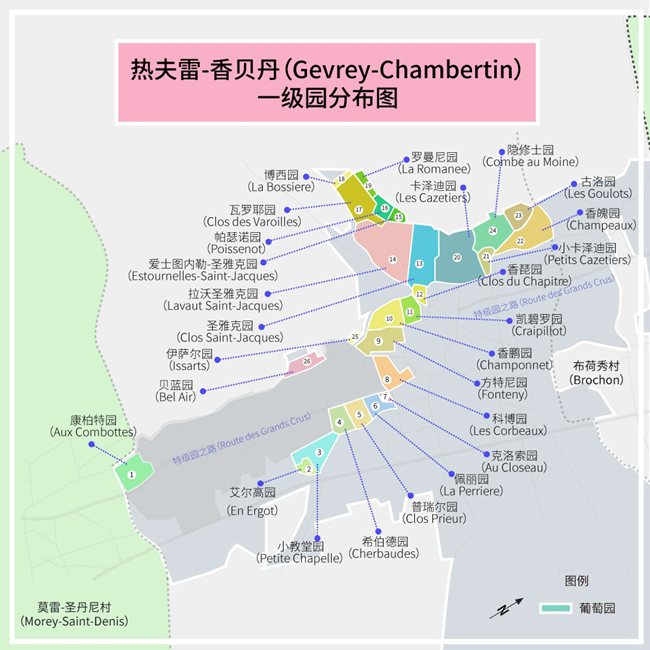 此外,勃艮第還有數(shù)個(gè)大大小小的村莊,不同村莊衍生出了不同的法定產(chǎn)區(qū),各個(gè)村莊獨(dú)特的風(fēng)土也為這些村莊刻上不同標(biāo)簽。比如,提到熱夫雷-香貝丹(Gevrey-Chambertin),就會讓人想到強(qiáng)勁、飽滿、豐富和堅(jiān)實(shí)的結(jié)構(gòu),以及極強(qiáng)的陳年能力。提到香波-慕西尼(Chambolle-Musigny)就讓人想到優(yōu)雅與精致。