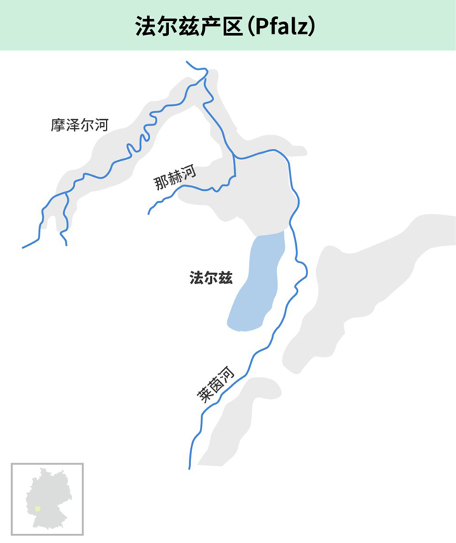 法爾茲產區雷司令的種植面積僅次于摩澤爾,釀造的雷司令葡萄酒口感醇厚而細膩,酸度比摩澤爾出產的雷司令葡萄酒要低。在法爾茲,雷司令的種植面積約占總種植面積的四分之一,萊茵平原(Rhine Plain)為葡萄提供了最佳的生長條件。這里的土壤類型多種多樣:風化的彩色砂巖、板巖、玄武巖和富含貝類化石的石灰巖,都為雷司令葡萄酒帶來了獨特的風味。