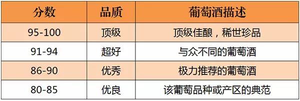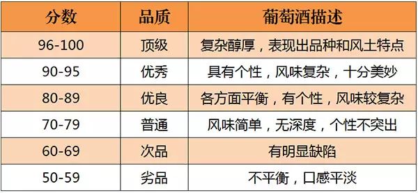 美國的《葡萄酒與烈酒》(Wine & Spirits)雜志是世界上最權(quán)威的葡萄酒雜志之一。自 1994年起,《葡萄酒與烈酒》也開始采取百分制對葡萄酒進(jìn)行評分,葡萄酒首先會經(jīng)過一些葡萄酒專業(yè)人士進(jìn)行初次品嘗篩選,之后才會送到專業(yè)“評酒團(tuán)”品評,所以該雜志評分的葡萄酒品質(zhì)都不錯。評分標(biāo)準(zhǔn)如下所示: