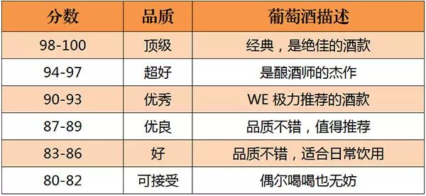 1988 年,《葡萄酒愛好者》(Wine Enthusiast,簡稱 WE)創(chuàng)刊于美國,這是一本涉及范圍最廣的專業(yè)葡萄酒電子刊物,幾乎包羅了葡萄酒世界的所有方面,如葡萄酒、烈酒、美食、旅游及娛樂等。其評分體系在葡萄酒雜志中有一定權(quán)威性,不過與前面兩個評分體系不同的是,WE 的評分只有 80-100 分