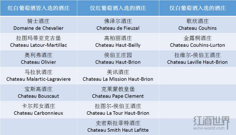 直到1953年,法國國家原產地命名管理局(Institut National des Appellations d'Origine,簡稱INAO)對格拉夫的紅葡萄酒進行評級,并擬定了一份非官方名單,共有13座酒莊入選。1959年,該分級制度在原來的基礎上新添了對格拉夫干白葡萄酒的評級。在最終公布的官方名單中,共有16座列級莊入選,其中紅、白葡萄酒均入選的有6座,僅紅葡萄酒入選的有7座,僅白葡萄酒入選的有3座。