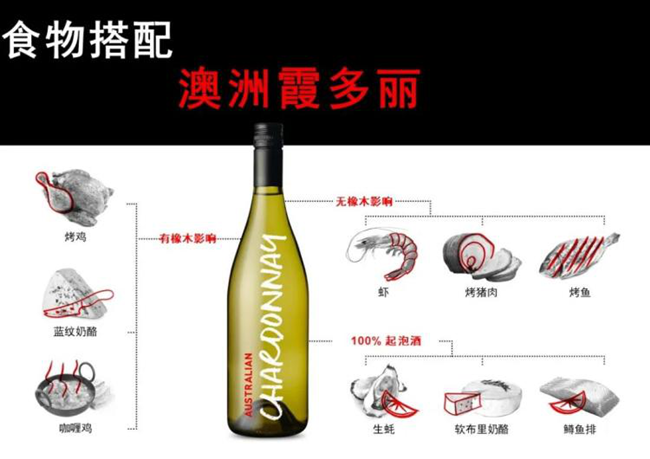 澳大利亞霞多麗的多種風(fēng)格使其成為市場(chǎng)上最易搭配食物的葡萄酒。豐潤(rùn)的質(zhì)感和高酸度的霞多麗可以和軟奶酪完美搭配。濃郁和有橡木影響的霞多麗風(fēng)格能夠搭配重口味的魚肉或禽類菜肴。未受橡木影響的清瘦型霞多麗和較淡和辛辣的菜肴,特別是海鮮和魚類,或奶油菜式非常相配,只要葡萄酒中含有足夠的酸度,就能夠分解奶油的肥膩感。