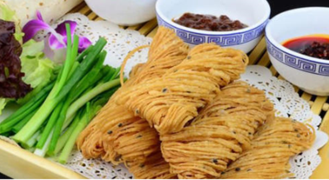 馓子,一種油炸面食,古稱“寒具”。許多地方便在寒食節中創造出各式的“寒食”,歷經數代沿承至今,成了一道道獨特的清明時令小吃。