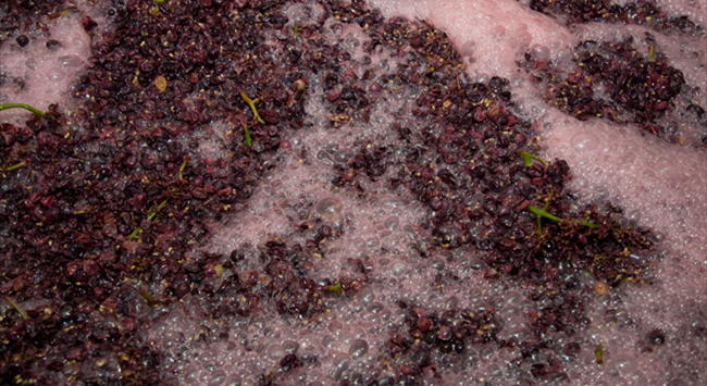 ③ 將完整的整串葡萄與經破碎的葡萄混合:發酵開始后,在經過破碎的葡萄中加入整串葡萄,這些葡萄浸泡在其中與氧氣隔絕,便會開始果內發酵。發酵過程中經過壓帽,完整的葡萄便會逐漸破碎。