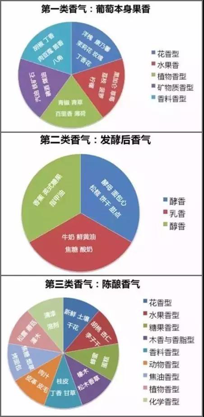 葡萄酒一共有三大類香氣,分別是葡萄本身香氣、發(fā)酵產(chǎn)生香氣、陳釀產(chǎn)生香氣,下面的三張圖就具體描述了這三類香氣。