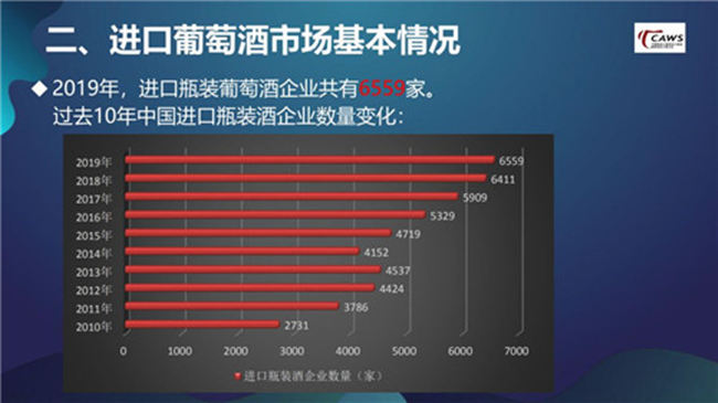 進(jìn)口瓶裝葡萄酒企業(yè)數(shù)量不斷增加,中小企業(yè)面臨挑戰(zhàn)。 從過去10年的數(shù)據(jù)來看,中國進(jìn)口瓶裝葡萄酒企業(yè)數(shù)量整體上是不斷增加的。2019年也不例外,進(jìn)口瓶裝葡萄酒企業(yè)共有6559家,比2018年增加了148家。產(chǎn)生這種情況的原因,我認(rèn)為有兩個,一是葡萄酒的商品屬性,決定了它經(jīng)營上的分散化;二是中國葡萄酒企業(yè)自身韌性十足,在市場大調(diào)整時期仍在堅(jiān)持。