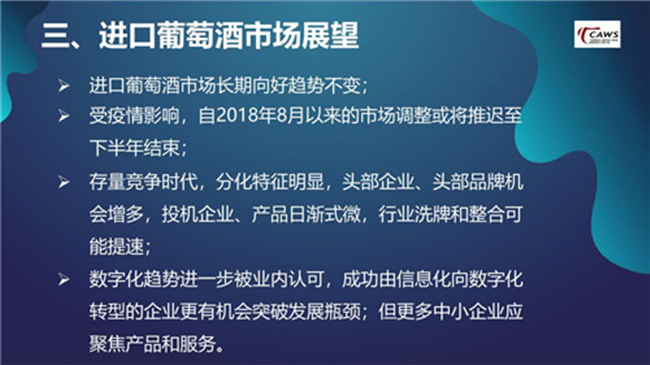 在今年,雖然疫情延長了市場調(diào)整期,但國內(nèi)經(jīng)濟(jì)韌性十足、防控工作及時到位,在年底或明年初,葡萄酒市場會逐步邁入佳境。對于進(jìn)口葡萄酒而言,向好的趨勢不會改變。值得一提的是,隨著國家經(jīng)濟(jì)增速的減緩,進(jìn)口葡萄酒市場轉(zhuǎn)變?yōu)榇媪渴袌龅那闆r越發(fā)明顯,一個顯著熱點(diǎn)就是分化,頭部企業(yè)的機(jī)會增多,投機(jī)企業(yè)、產(chǎn)品日漸式微,行業(yè)洗牌和整合可能提速。