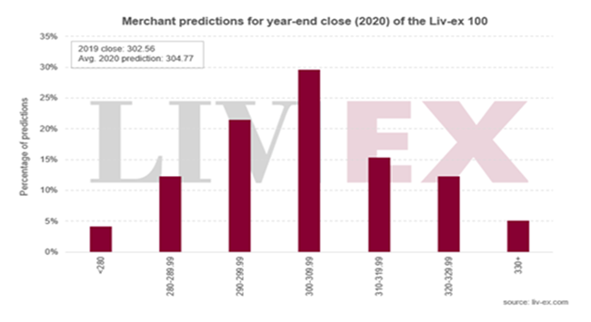 今年,Liv-ex會員預測優質葡萄酒市場將在2020年持平。平均而言,受訪者預測此行業基準指數將上升0.7%,收于304.77點。 預測的中位數則稍低,為303.00點,上升0.1%。