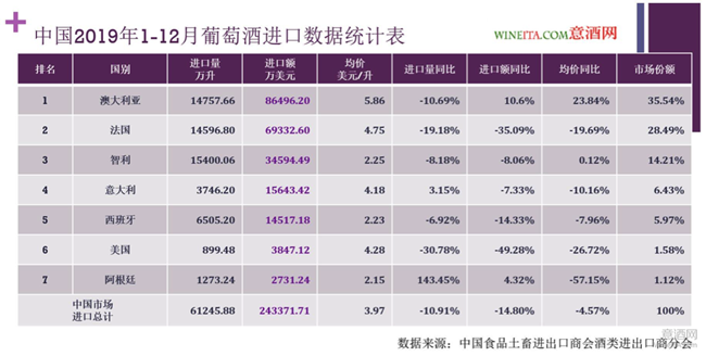 近日,中國(guó)食品土畜進(jìn)出口商會(huì)酒類進(jìn)出口商分會(huì)發(fā)布了來(lái)自中國(guó)海關(guān)的2019年度中國(guó)進(jìn)口葡萄酒統(tǒng)計(jì)數(shù)據(jù)。2019年中國(guó)進(jìn)口葡萄酒總量為61245.88萬(wàn)升,進(jìn)口總額為24.3371億美元,分別相比2018年下降了10.91%和14.8%。進(jìn)口葡萄酒均價(jià)為3.97美元/升,同比2018年度下降了4.57%。