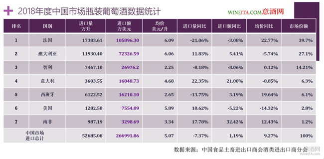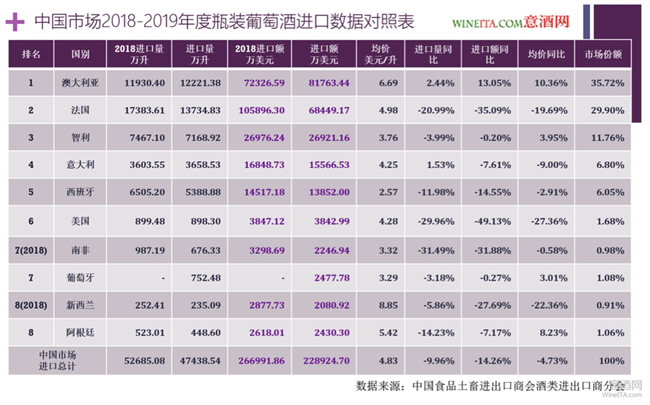 為了更好的對(duì)照數(shù)據(jù),我們將2018年度瓶裝葡萄酒進(jìn)口額排名前八的供應(yīng)國(guó)數(shù)據(jù)也放進(jìn)2019年瓶裝葡萄酒進(jìn)口數(shù)據(jù)中。從對(duì)照表可以看出,2019年度中國(guó)進(jìn)口瓶裝葡萄酒總量為47438.54萬(wàn)升,瓶裝葡萄酒進(jìn)口總額為22.8924億美元,相比2018年分別下降9.96%和14.26%。瓶裝葡萄酒進(jìn)口均價(jià)為4.83美元/升,相比2018年下降了4.73%。