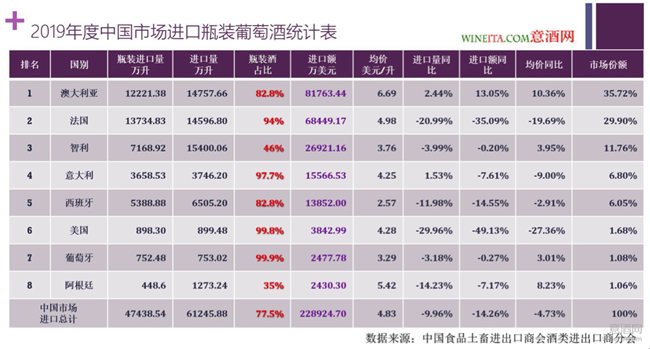 排名第一的澳大利亞瓶裝葡萄酒進(jìn)口總量為12221.38萬(wàn)升,進(jìn)口總額為8.1763億美元,相比2018年分別增長(zhǎng)2.44%和13.05%。進(jìn)口均價(jià)為6.69美元/升,相比2018年增長(zhǎng)了10.36%。占據(jù)了35.72%的市場(chǎng)份額。相比2018年度27.1%的市場(chǎng)份額,增長(zhǎng)了近32%。