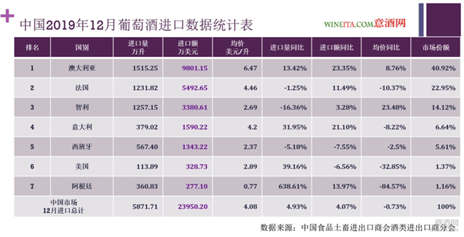讓意酒網(wǎng)對(duì)阿根廷引起關(guān)注的原因,是下圖這張2019年12月葡萄酒進(jìn)口數(shù)據(jù)統(tǒng)計(jì)表,排在第七位的阿根廷,進(jìn)口量同比暴增638.61%,進(jìn)口額卻只增長(zhǎng)了13.97%,進(jìn)口均價(jià)只有0.77美元/升,下滑幅度達(dá)到84.57%。當(dāng)然,排在第四位的意大利,在2019年12月也出現(xiàn)了進(jìn)口量同比增長(zhǎng)31.95%,和進(jìn)口額同比增長(zhǎng)21.1%的優(yōu)異增長(zhǎng)。
