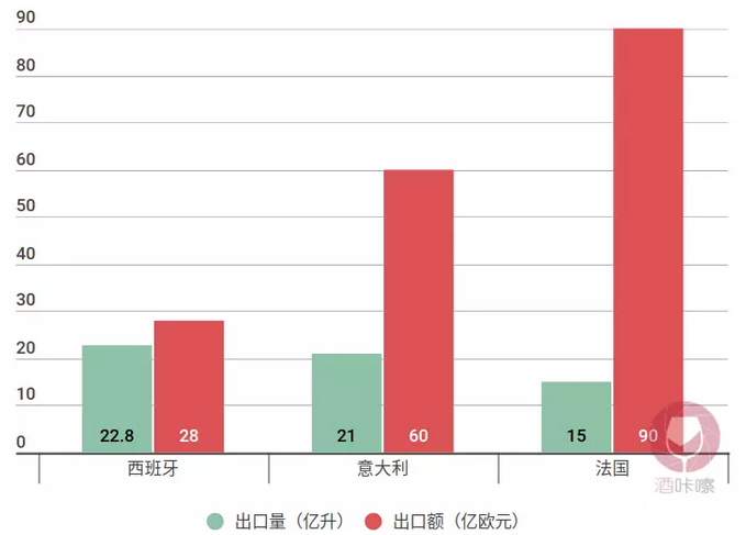 2017,西班牙葡萄酒的出口量超越法國(guó)和意大利,位居世界第一,不過(guò)盡管西班牙葡萄酒出口量如此龐大,它與意大利和法國(guó)葡萄酒所帶給人的印象完全不同,在人們的印象中,西班牙葡萄酒向來(lái)價(jià)格便宜,而這一點(diǎn)在其出口額上也能體現(xiàn)。
