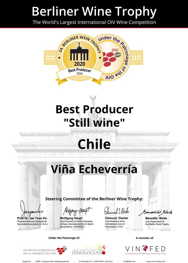 與此同時,智利-安智利雅家族酒莊(Echeverria Family Wines)更是在此項賽事中榮獲了“2020柏林葡萄酒大獎賽-智利最佳生產(chǎn)商”的稱號!其實一切的榮譽(yù)都離不開安智利雅家族酒莊自身扎實的發(fā)展戰(zhàn)略,自1700年起,安智利雅家族在智利農(nóng)業(yè)領(lǐng)域始終業(yè)績出眾,20 世紀(jì)初便開始從事葡萄栽植及釀酒行業(yè)。安智利雅家族酒莊更是擁有一個堅不可摧的工作團(tuán)隊,具有悠久的釀酒傳統(tǒng)與經(jīng)驗,且與環(huán)境和諧共存!其強(qiáng)大的凝聚力來自深邃的家族根基、對釀酒藝術(shù)的共同激情、對完美的不懈追求以及為達(dá)到客戶滿意而作出的全身心的投入!