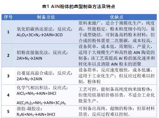 氮化鋁陶瓷的優(yōu)良性能與原材料粉體的性能有著直接的關(guān)系,高性能AIN粉體是制備高熱導(dǎo)率AIN陶瓷的關(guān)鍵。制備AIN粉體的方法有很多種(見下表1),也都存在各自的不足,但他們都有一個共同點(diǎn)就是成本較高。