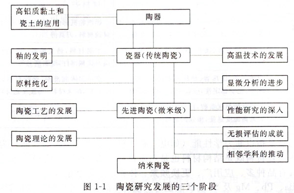 總的來說,陶瓷是一種既古老而又年輕的_:程材料,陶瓷材料的發(fā)展經(jīng)歷了從陶瓷發(fā)曩裂瓷器.從傳統(tǒng)陶瓷發(fā)展到先進(jìn)陶瓷,從先進(jìn)陶瓷發(fā)展到納米陶瓷三次重大飛躍(見圖I-I),而這三次飛躍只是中華文明史的一個(gè)縮影。