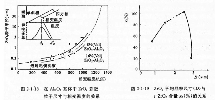 氧化鋯的顆粒尺寸,對相變增韌是有影響的。實(shí)踐表明,氧化鋯相變的條件應(yīng)是單位體積的氧化鋯顆粒數(shù)的總能量相當(dāng)于氧化鋯相變引起的界面能變化。氧化鋯在陶瓷基體中的相變溫度是氧化鋯顆粒尺寸和化學(xué)組分的函數(shù),圖2-1-18表明了1696 (VoI) 氧化鋯-A1209和8~6( V01)氧化鋯 -Alz 03系統(tǒng)中的氧化鋯相變溫度與其顆粒度之間的關(guān)系。由此看出,在冷卻過程中顆粒大者優(yōu)先由四方相轉(zhuǎn)變?yōu)閱涡毕?。即氧化鋯彌散于陶瓷基體中的相變溫度M.是隨著氧化鋯顆粒的減小而偏低的。當(dāng)氧化鋯顆粒小到足以使相變溫度偏移到常溫下,即t-氧化鋯 -直保持到常溫,則陶瓷基體中就儲存了相變彈性壓應(yīng)變能(,-?。?,只有當(dāng)基體受到了適量的外加張應(yīng)力,其對氧化鋯的束縛得以解除,才能發(fā)生四方相氧化鋯向單斜相氧化鋯轉(zhuǎn)化。如果氧化鋯顆粒尺寸較大,則其相變溫度處于常溫以上,那么制品冷卻至室溫之前,t-氧化鋯就已自發(fā)地轉(zhuǎn)化為m-氧化鋯。而且氧化鋯品粒尺寸對t-氧化鋯含量的影響也是很重要的。如圖2-1-19所示。從圖中看出,最高的t-氧化鋯的含量只處于很窄的晶粒尺寸范圍內(nèi)。